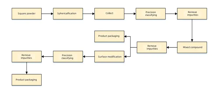 Wir verwenden eckiges Silizium-Mikropulver als Rohmaterial, zerkleinern, sieben, reinigen und führen weitere Vorbehandlungen durch. Ein Luftstrombrecher zerkleinert das eckige Silizium-Mikropulver. Nach einer mehrstufigen Vorbehandlung sieben wir es auf eine geeignete Partikelgröße. Wir verwenden Acetylen, Erdgas und andere Gase als Wärmequelle zum Schmelzen des Pulvers, und die Flamme bleibt sauber und schadstofffrei. Eine Hochtemperaturflamme schmilzt das eckige Silizium-Mikropulver geeigneter Partikelgröße sofort, und wir kühlen es schnell ab, um es zu kugelig zu machen. Wir erhalten hochreines, kugelförmiges Silizium-Mikropulver mit gleichmäßiger Partikelgröße.