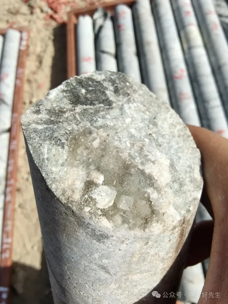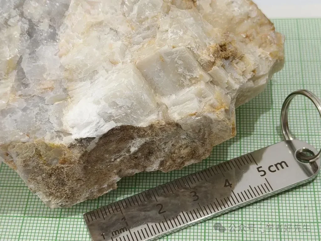 Los cristales de calcita se producen en fisuras de esquisto de cuarzo biotita, y su color varía de transparente a blanco.