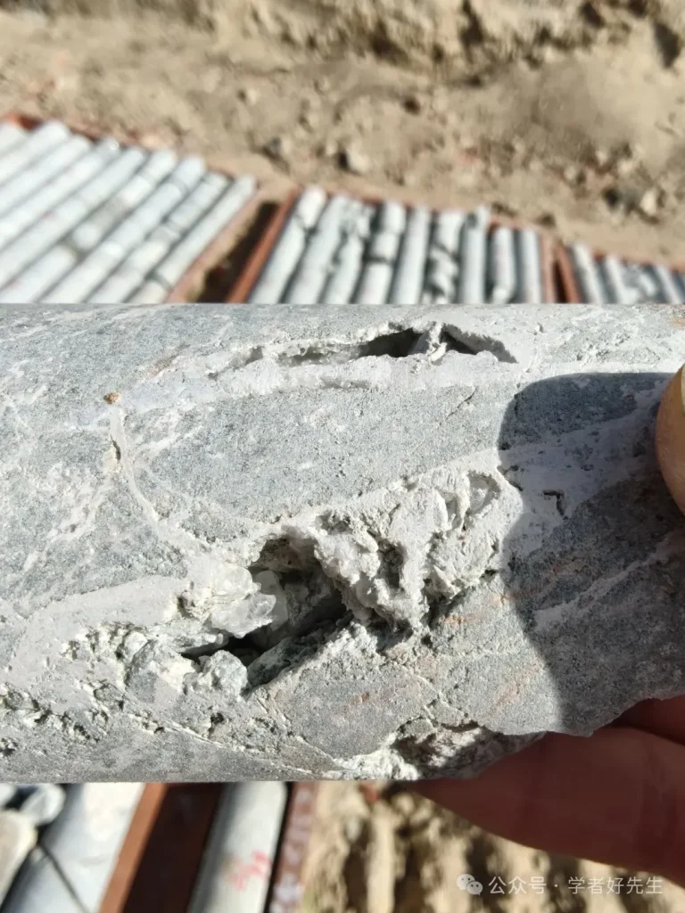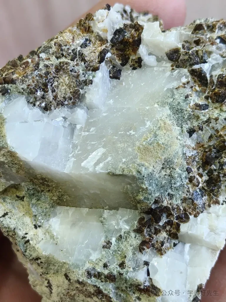 Producido en zonas de fisuras de skarn, de color blanco.