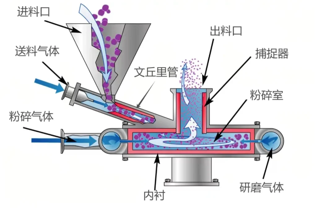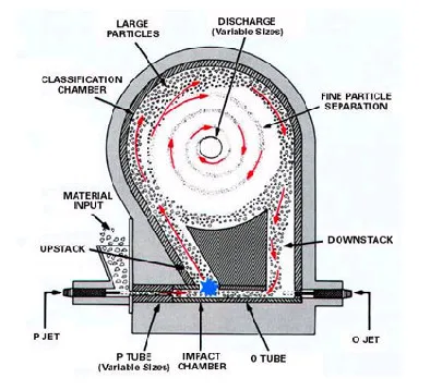 Değirmen, parçacıklar arasındaki yüksek hızlı çarpışmalarla ezilir. Hız, iki hava akışının hızlarının toplamıdır. Yani yarı eforla iki kat sonuç elde edilir. Güçlü bir güce, yüksek hıza sahiptir ve enerjiyi iyi kullanır. Oldukça verimlidir ve ince parçacıklar oluşturur. Büyük avantajları var. Sert, kırılgan veya yapışkan malzemeleri ezebilir. Aynı zamanda çarpışmak için parçacıkları kullanır. Bu, yüksek hızlı jetlerin sabit darbeli parçalarda aşınmasını önler. Aynı zamanda daha saf mikro-nano tozlar da üretebilir.