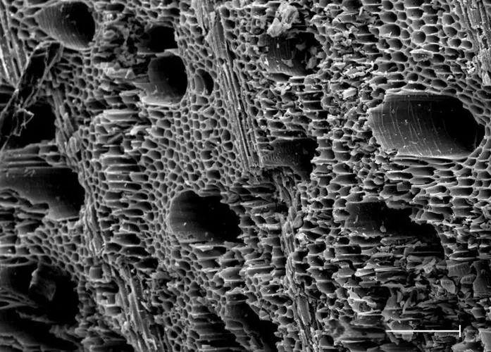 (2) Than tre có nhiều lỗ xốp, thích hợp cho quá trình thanh lọc chất lỏng. Chủ yếu là lỗ xốp lớn và một lượng nhỏ lỗ xốp, khả năng hấp phụ yếu, thích hợp để lọc tạp chất phân tử lớn. Sau khi hoạt hóa vật lý, than hoạt tính than tre có tỷ lệ lỗ xốp lớn, lên đến hơn 90%, có thể hấp phụ hiệu quả các vật liệu phân tử nhỏ.